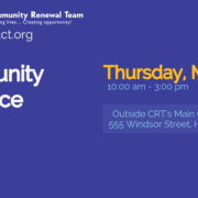 Community Resource FairJoin the Community Renewal Team (CRT) for a FREE Community Resource Fair on Thursday, May 27, 2021 from 10:00 am to 3:00 pm outside their main offices at 555 Windsor St., Hartford.